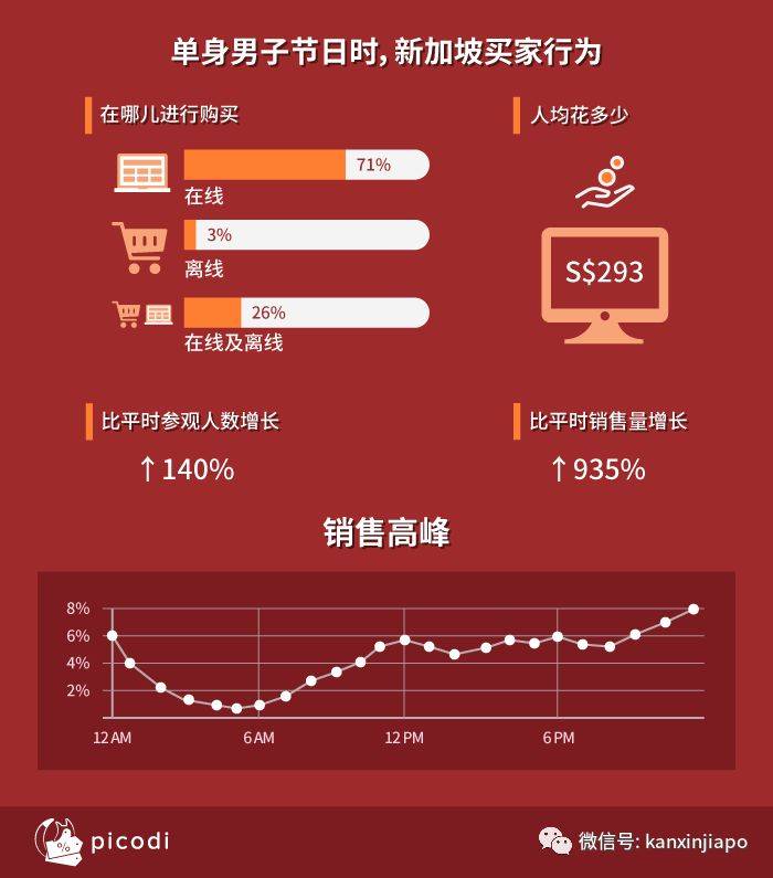 新加坡人在单身男子节日时间比平时积极些购物事实并不奇怪。据我们内部统计,在线购物数量比平时增长 935%。据调查数据,促销活动时新加坡人准备花S$293。11月11日销售高峰是晚上11点,这件事具有象征意义。