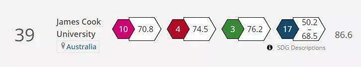 该排名向所有教授本科生的全球大学开放。大学必须积极地自愿参与并分享大量的数据进行排名,首次排名吸引了全球很多高校的大力支持。来自81个国家的560所大学参与了11个可持续发展目标 (SDGs) 的排名,共有来自76个国家的462所大学进入总排名。其中,詹姆斯库克大学位列澳大利亚大学第 5 位,世界大学第 39 位。