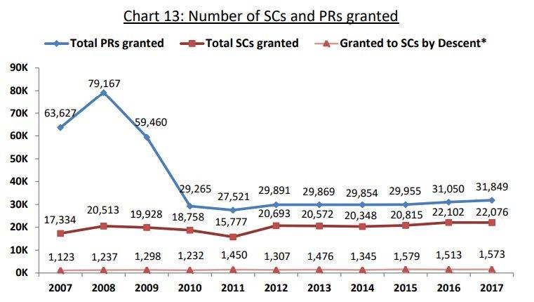 新加坡每年会增加15 000到25 000的新公民名额,大部分是给那些在新加坡组建家庭,或者长期在新加坡读书、工作或生活的人。其中的7%,也就是约1600个名额,给了那些新加坡人在国外生的小孩。在2017年,PR人数增加了31 849。这些新的永久居民中,有60.1%的人来自东南亚,31.8%来自亚洲其他国家,以及 8.1%来自亚洲以外的地区。