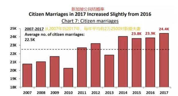 25-29岁的女子单身,从2007年的60.9%,增加了7.2%!也就是说,在2007年,10个25-29岁的年轻女子中有6个是单身。而到了2017年,10个年轻女性中,就有7个是单身!新加坡单身率这么高,那让我们看看那少部分的脱单人士的情况如何。接下来的数据可能对单身汪来说是一记暴击,因为……越来越多人结婚啦。