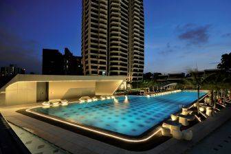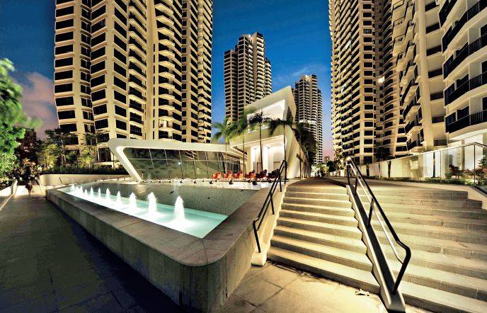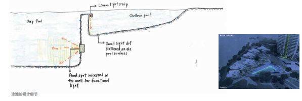从其中一座大楼37层的俯视图可以看出,线性照明突出强调了建筑的几何结构和形式的连续性。两个游泳池使用水下LED照明系统,光线均匀分布