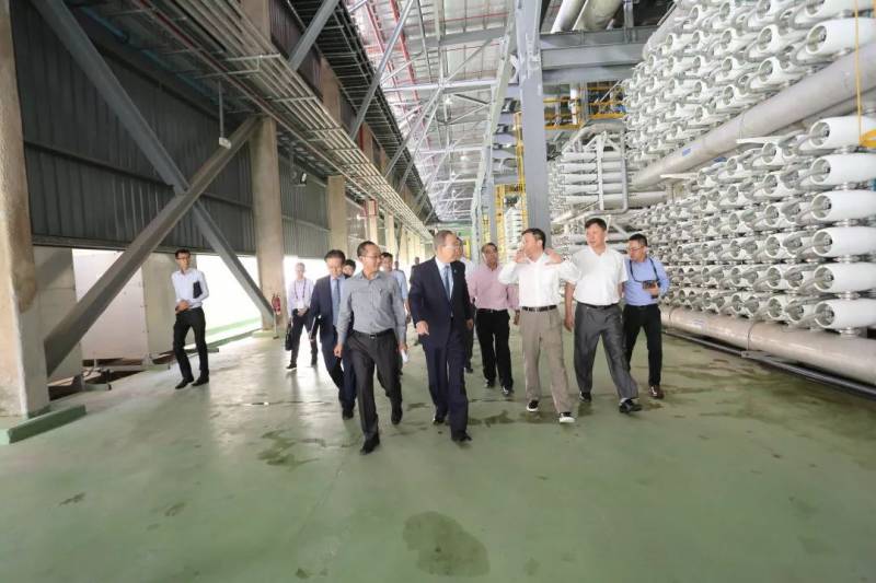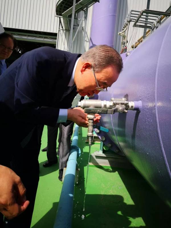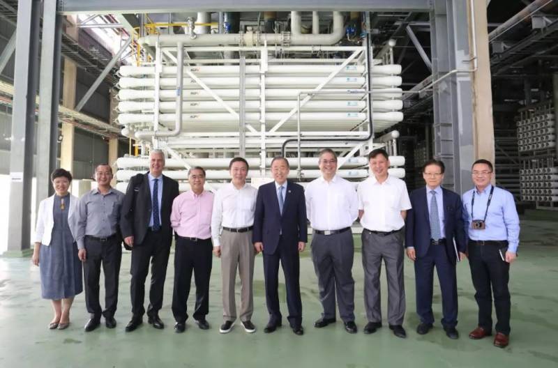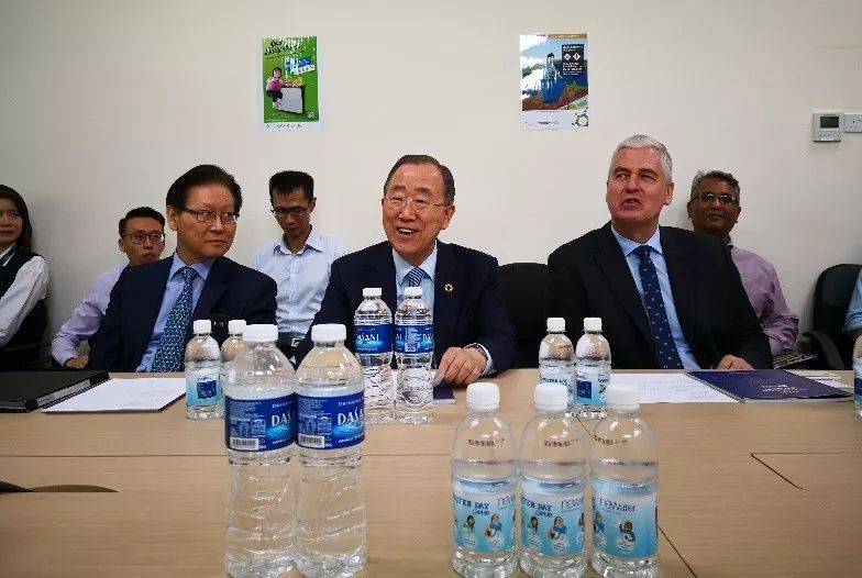 2018年7月11日,在新加坡出席“新加坡国际水资源周”的前联合国秘书长潘基文,在韩国驻新大使Kim Bong-hyun、全球绿色发展署(GGGI)总干事Frank Rijsberman以及新加坡PUB副局长Richard Hoo的陪同下莅临新加坡樟宜Ⅱ新生水厂考察。