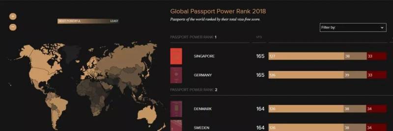 新加坡护照可以免签165个国家。截止到2018年10月29日, 中国护照免签的国家或地区数量为77个。