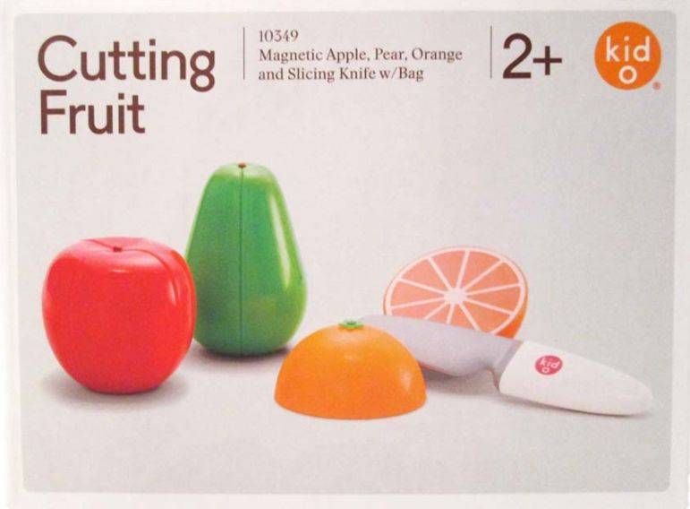 这个塑料做的刀看起来很安全,但可能会对孩子造成穿刺和其他钝性创伤。还有,如果粘水果的磁力贴掉落,家长没有及时发现,还有可能被孩子吃进肚子里。
