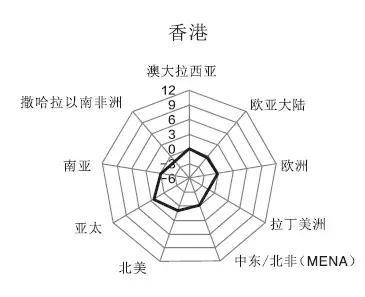 但对比香港、新加坡可以发现,同为亚洲城市,它们对外的连接性却更显均衡——在高度连接亚太地区的同时,也与欧洲、北美的主要世界城市(伦敦、纽约)保持紧密联系,以推动它们城市地位的提升。