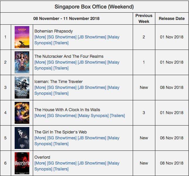 先看票房,上期的前两位互换了位置,《波西米亚狂想曲》反超《胡桃夹子和四个王国》登上榜首,第三名的《滴答屋》下降一位位居第四。三部新片占据了其他三个前六的位置,《冰封:时空行者》占据了第三,《蜘蛛网中的女孩》与《霸主》分列第五第六。