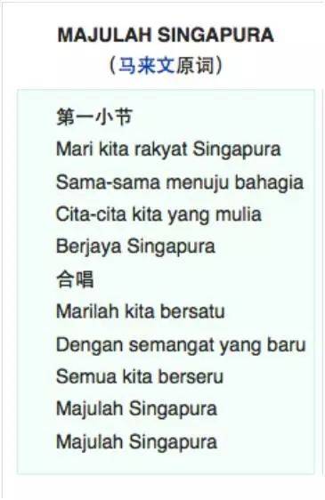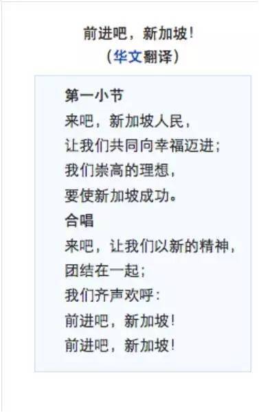 人们只可以唱国歌的马来语原词,不过新加坡其他三种官方语言的官方翻译获得当局认可,它们是英语、华语以及淡米尔语。
