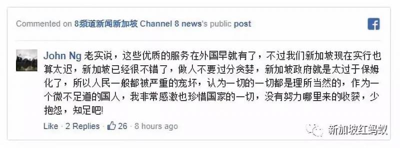 也有些网民认为,新加坡人民基本上被保姆型政府宠坏了,嘴上抵死说不要,内心其实是暗自欢喜的。这些优质服务早已在中国大陆、台湾和香港实施,新加坡这么做也只是与时并进。