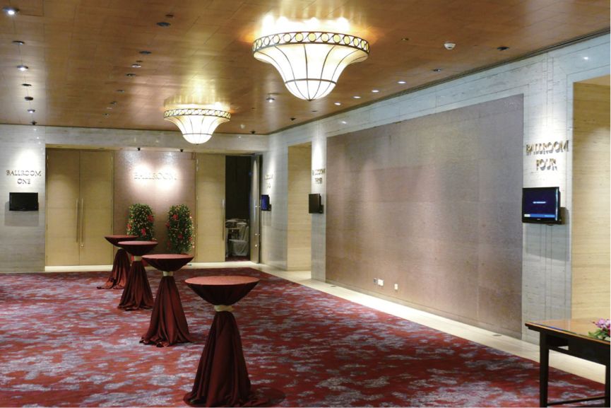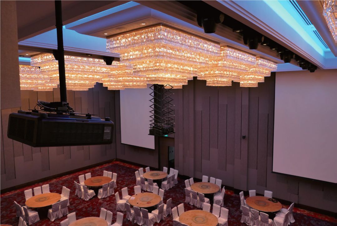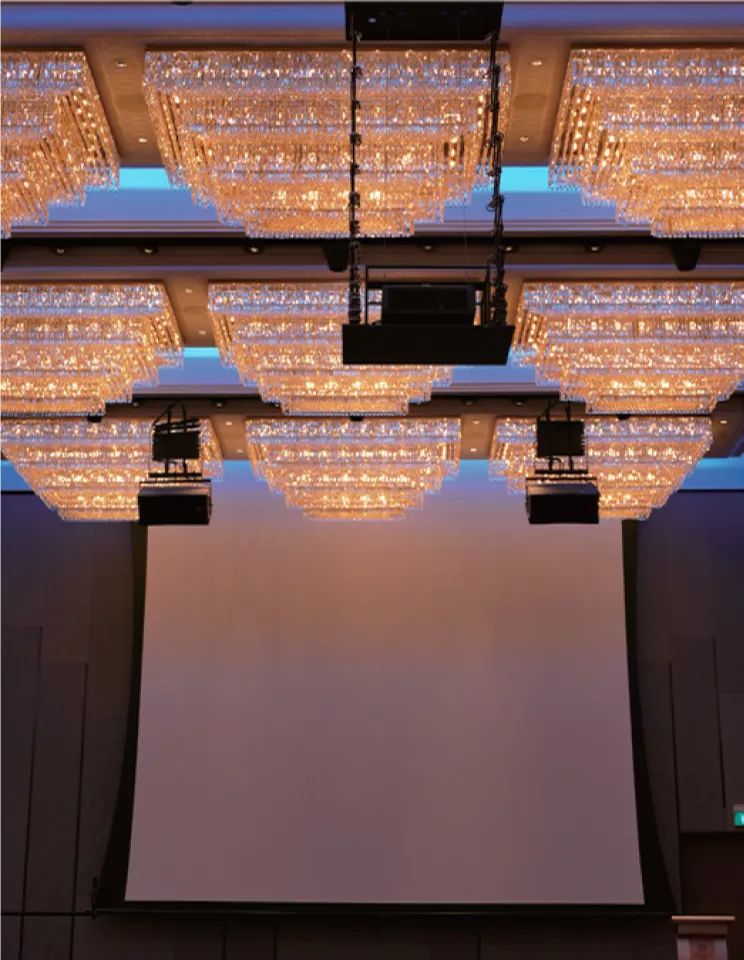 音视频工程师Phyo Han描述了新的数字系统如何大大减轻了他的日常工作量。“之前,我们花了很多时间听取客户对旧系统的抱怨并尝试修复它。现在,我们需要做的就是为各类客户提前做好准备,不论是现场乐队、公司活动,还是婚礼或私人聚会,通通不在话下。系统设置可以轻松保存并重复用于其他活动。有了我们的流动式舞台,这个厅的使用变得非常灵活且易于安装,多个租用者可以将他们的乐器在七个不同的位置接入我们的主扩声系统之中。”喜来登大厦天花板四周空调通风口的存在意味着投影屏幕必须悬挂在离墙壁一定距离的位置,而不是紧贴著墙壁。现有的PTZ摄像机系统和Denon DN-DN4500播放器继续在装修一新的宴会厅内发挥作用。“由于预算有限,我们选择让那些被认为合用设备继续服役,”Fong先生说道。“不过,我们其他许多建议也获得了批准,例如在两个较大的宴会厅内增加了两台电动屏幕投影机。透过我们在这类空间的实践经验,酒店方意识到他们可以通过提高空间配置的灵活性来最大化场地预订率。”
