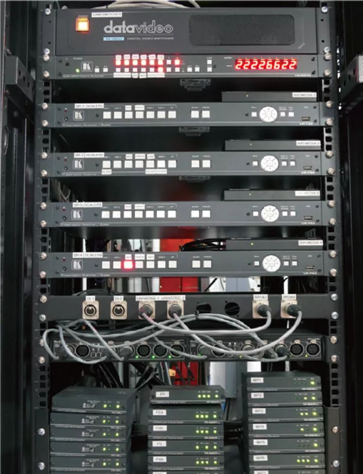 为了满足用户需求,宴会厅内安装了七块Kramer壁装扩展面板,能够提供VGA、HDMI和音频输出,大大增加了系统灵活性。来自面板的信号经倍线后在VS-88HDxl 8进8出矩阵中进行处理,并在Datavideo SE-2850切换器上进行混合。一台8进8出数字信号处理器用于完成各种空间组合和分隔的设置。快思聪 AV3无线媒体iPad触摸屏控制为设施管理人员带来了操作易用性,可以很方便地对音源、电平、DSP设置、空间照明、Wi-Fi和视频投影进行控制。此外,40只Martin MH1 Profile摇头灯经过快思聪软件进行编程,可单独或组合使用。