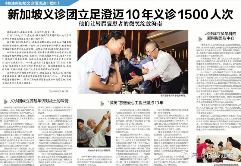 2009年至今,新加坡海南会馆组织新加坡中央医院及其他知名唇腭裂治疗机构的医疗专家,每年都赴海南开展“海南微笑”义诊活动。