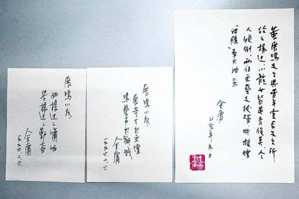 金庸留下信笺,鼓励黄展鸣继续作画。(受访者提供)