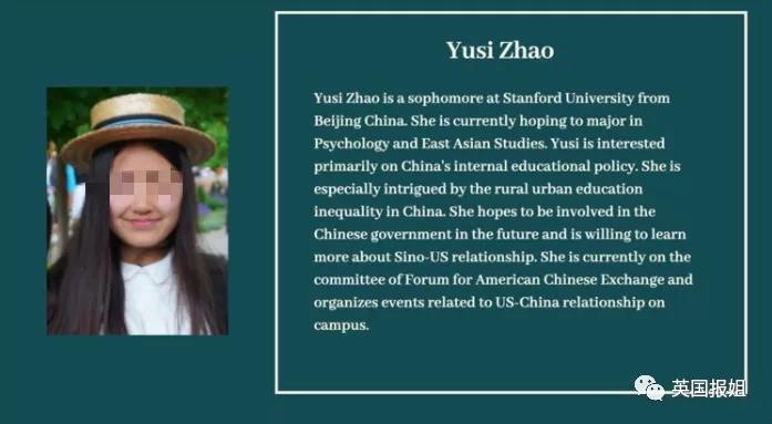 Yusi Zhao在史丹福大学主修的是心理学和东亚研究,并且她还是史丹福大学中美交流论坛(FACES)的成员,在成员介绍当中对她的描述“尤其对中国城市农村教育不公平问题感兴趣。