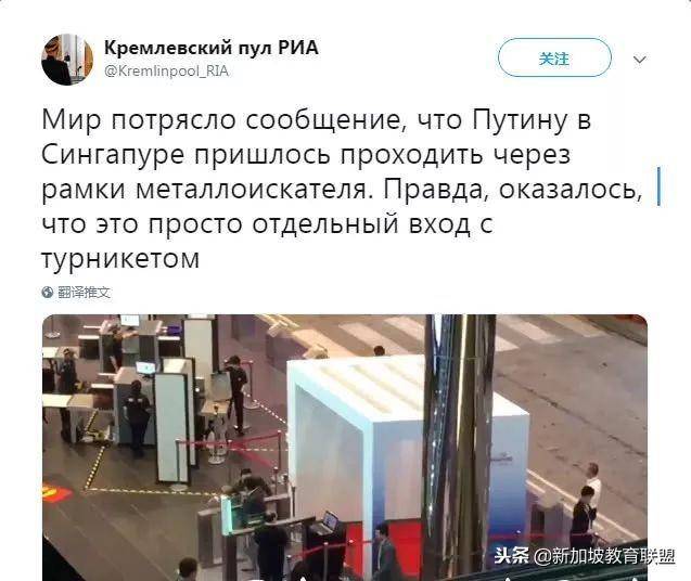 俄新社总统随行记者团Kremlinpool_RIA随后在Twitter上发文称,“世界都被普京在新加坡被要求通过安检门的消息震惊了。实际上,这只是一个带旋转栅门的独立入口”。