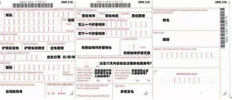 2.白卡 在飞机上或者入关处会发放入境白卡,入关前记得填写(可参考下图)。记得保存好白卡,这就是你在新加坡拿到学生证前的临时身份证!