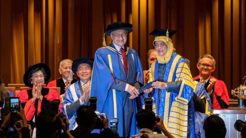 本周,到访新加坡的马来西亚总理马哈迪(中译“马哈蒂尔”)被母校新加坡国立大学授予名誉博士。新加坡国立大学(简称“国大”)为校友马哈迪及夫人西蒂哈斯玛举行了特别授予仪式,国大名誉校长、新加坡共和国总统哈莉玛亲自为马哈迪校友授予学位。
