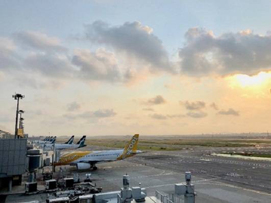 酷航和胜安航空客机停靠在新加坡樟宜机场。