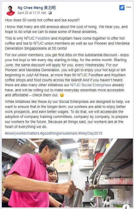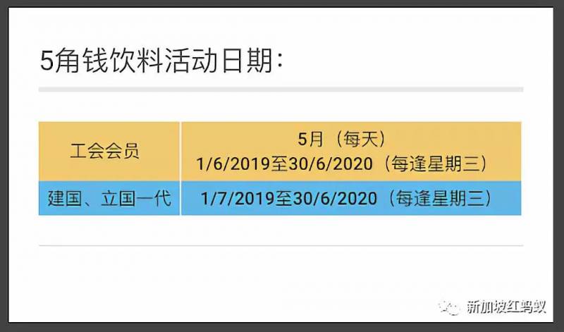 超过90家职总富食客和Kopitiam将出售5角钱的优惠饮料给建国、立国一代和工会会员(NTUC官网)