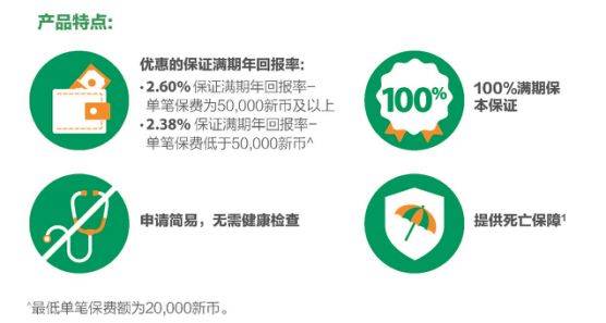 举个例子,若投保人一次性支付至少5万(含)新元保费,可享有2.6%保证满期年回报率,期满取回本金。 这意味着支付5万元保费,五年后可保证拿到5.685万元。若投保人一次性支付保费为2万新元,可享有2.38%的保证满期年回报率。五年后可保证拿到2.2498万元。