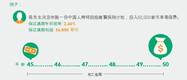 广告备注1:若受保人在五年保障期内不幸身故,中国人寿新加坡所付的身故赔偿额将相等于已缴付的单笔保费总额之101%,并扣除计划下的欠款 (如有)。