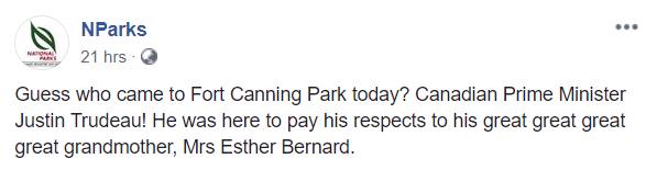 根据史料记载,帅哥总理的六代前祖母一生都居住于新加坡,直到41岁时去世,安葬在福康宁公园。所以,此次帅哥总理来新加坡开会,顺便开始了一段寻亲之旅。这是“公费认亲”啊!