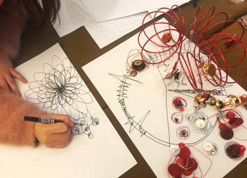 首先,参与者们需要将各自脑海中的线条画在纸上。接着,会场响起了三段不同节奏的音乐,大家跟随音乐的律动,再次画出不同的线条。这样,一份独一无二的“设计图”便完成了。最后,Ms. Jackie邀请大家使用提供的零件材料,创作和搭建自己的3D线条作品。在这个过程中,建构自己原有认知和新认知之间的联系,并且体验探究的乐趣。