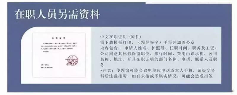 申请人公司中文在职证明原件(请注明任职时间,职务,工资,需包含公司抬头和注明公司同意其休假),在职证明信必须列有公司有关联系人的地址,电话和传真号码; (在职人员需提供,可参考以下样板)