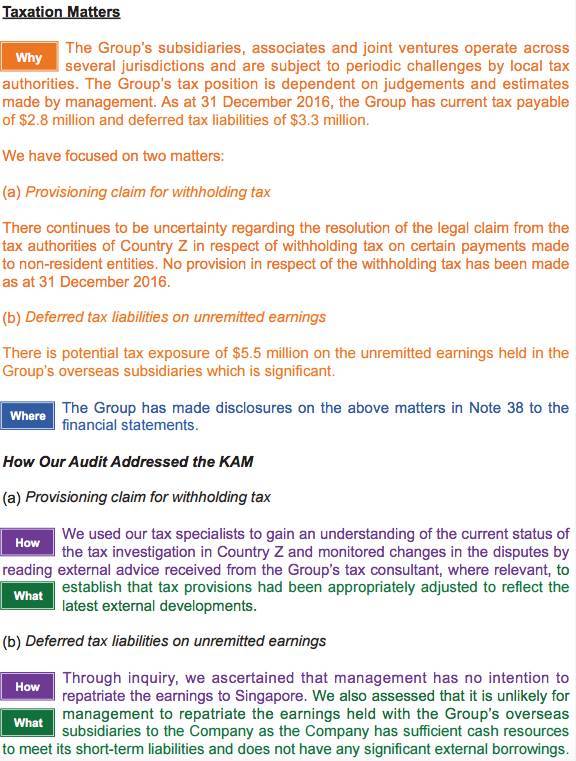 事件的重要性WHY- 集团海外子公司和联营企业在Z国多个业务地区,遇到了Z国当地税务局的税务挑战。集团的税务状况取决于公司管理层的判断和估计。截至到2016年12月31日,集团现行应交税款为280万新币,所得税延期负债为330万新币。