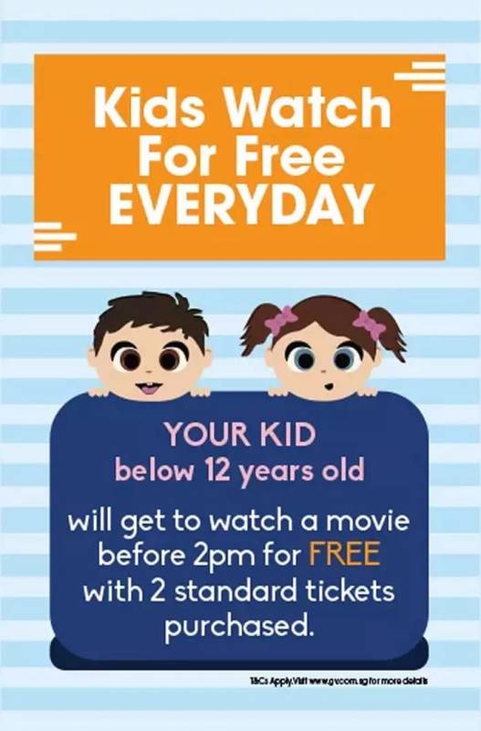 凡在Golden Village(GV)电影院购买任意2张标准成人票,可赠送一张12岁以下儿童免费观影票。
