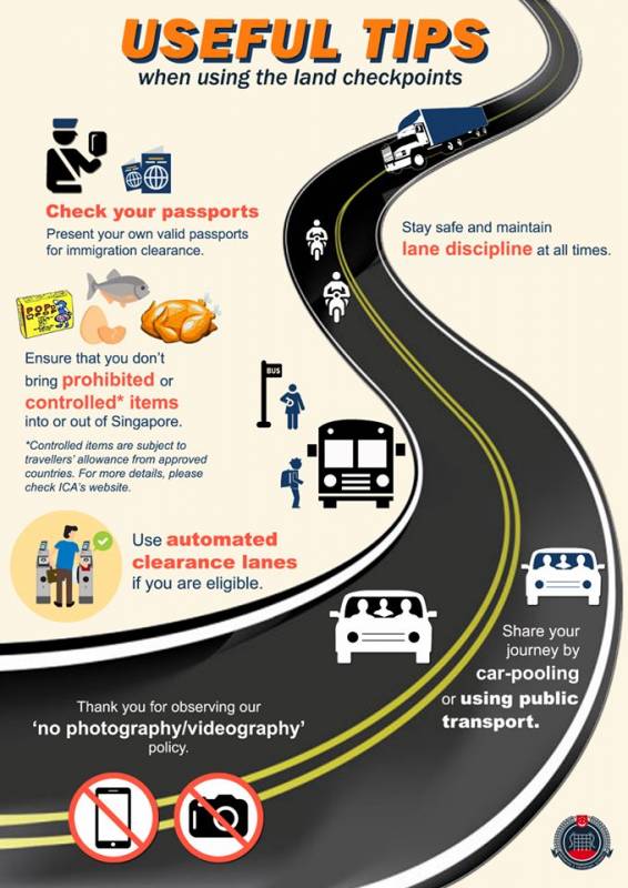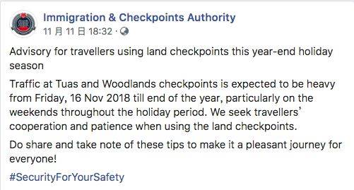 对此,新加坡移民与关卡局(ICA)发布提醒:从11月16日(星期五)开始,直到年底最后一天,兀兰、大士关卡将会非常繁忙。往返马来西亚的民众将会面临塞车的情况。