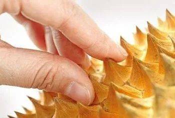 榴梿外面鼓起来的“小山”,平缓而微隆的“小山”中,正是香甜芳香的果肉,“小山”越多,果肉越多。通过看榴梿的尖刺,也可以了解果肉的多少,如果狼牙棒上多为平缓的、底面较大的椎形尖刺,证明榴梿果肉较多,成熟度较好;反之,如果尖刺多为又尖又细的形状,就证明果实不太成熟。