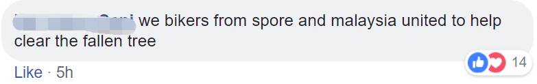 (我们这些新加坡和马来西亚的摩托车司机联手帮忙清理这些倒下的树)