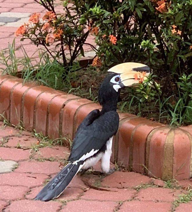 在新加坡,冠斑犀鸟偶尔会飞出“皇宫”,体察民情。2016年,就有网友有幸一睹鸟颜。