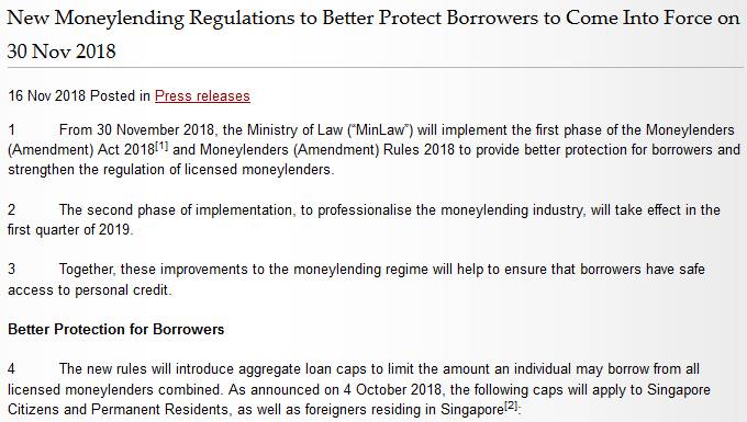 新加坡国会今年1月三读通过放贷人(修正)法案,第一阶段将在本月30日生效,以提供借贷者更多保障,并加强对放贷商的管制。