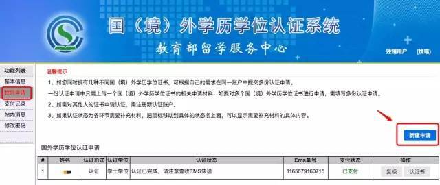 新建认证申请,因为我的已经认证完毕,所以下面已经出现了一条带有EMS运单号的认证申请。