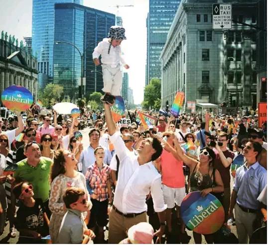 特鲁多的长相,是带点复古意味的好莱坞明星脸。浓密的卷发、光洁的皮肤、深邃的眉眼、高挺的鼻梁,再加上亲切而有感染力的笑容,作为政客是巨大的加分项。获得吃瓜群众好感是水到渠成的事。