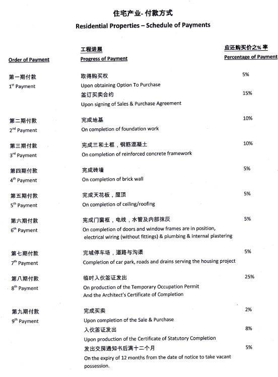新加坡是世界上金融法律最健全的国家之一,建国早期就制定了房产交易法,并且不断进行巩固和完善。在新加坡买房或者卖房手续都需要经过律师协助办理手续,不像国内有房产交易中心,您的代理律师会协助您办理房产更名过户手续,联系银行办理贷款拨款,公积金申请(如果需用到公积金),办理房子交房前还款事宜等。如果是期房项目,是挺有人性化的分阶段付款(参考下面图片),按照项目建造进度付款,通俗点讲,是干了多少活,收多少钱。新加坡买期房有很大优势,可以按照工程进度分阶段付款(参考下图),很大程度的减轻资金压力。