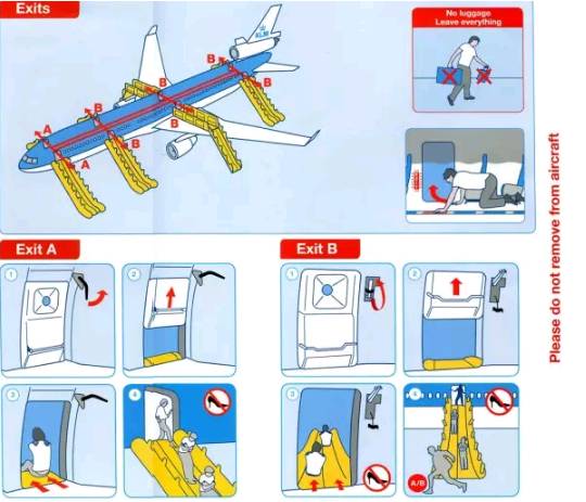 锐利物品易将逃生的滑梯刺破,因此身上有锐利物品及高跟鞋,在逃生时都必须舍弃。