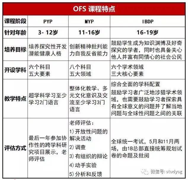 1. OFS提供课程包括国际幼儿课程(IEYC)Pre-K1至K2,国际小学课程(IPC)1至5年级和国际文凭(IB)6至12年级。12年级毕业后可前往美国、加拿大、欧洲、日本、韩国、澳洲等国家大学继续深造。