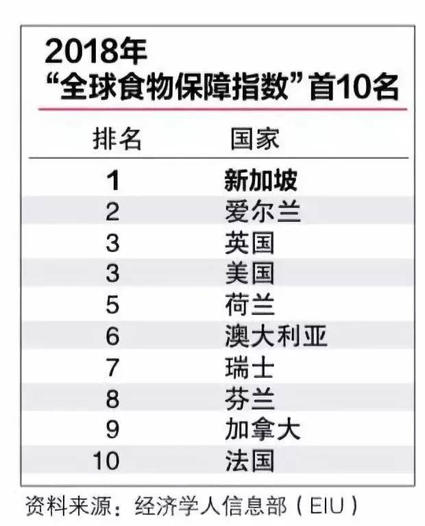 出产各种权威排名的《经济学人智库》公布2018年《全球食品安全指数报告》新加坡排名全世界第一