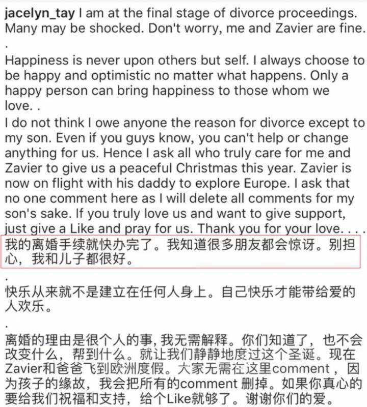 她发文表示表示离婚手续都快办完了,并告诉朋友们不要担心,她和儿子都很好。