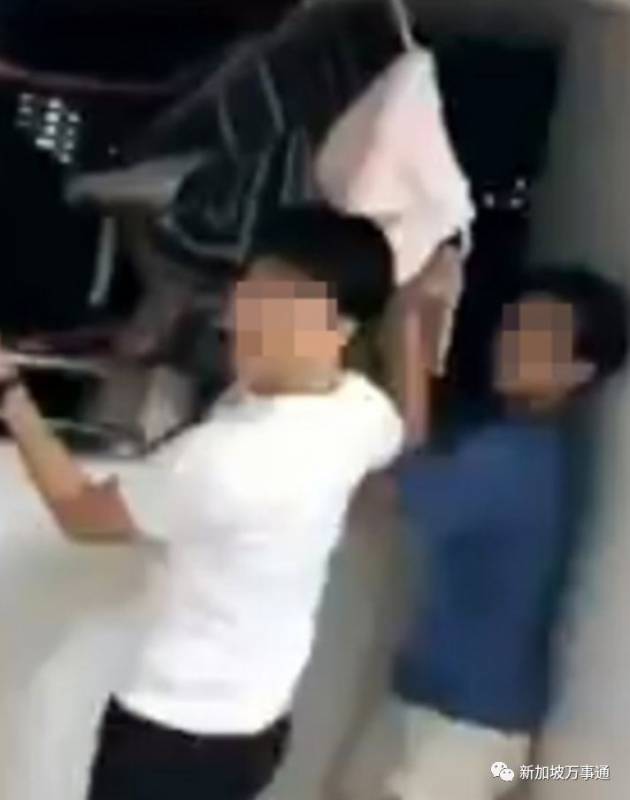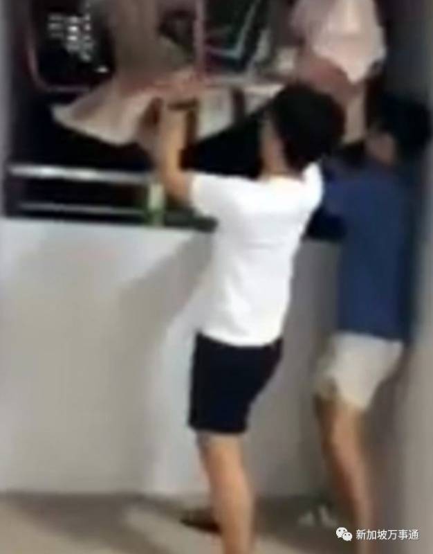 只见视频中,一名身着白色上衣的少年,正将一个晾衣架扛起,放到栏杆外。而另一名身穿蓝色汗衫的少年,同样握著晾衣架,正协助黑衣少年。