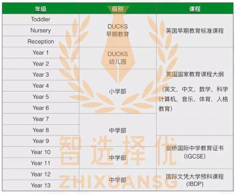 学校招收从2岁至18岁的学生,在幼儿园阶段遵循加强版的英国早期基础阶段课程 (EYFS),小学阶段则使用英国国家课程标准 (ENC),之后衔接国际中学会考课程 (IGCSE) 和国际文凭大学预科课程 (IB Diploma)。