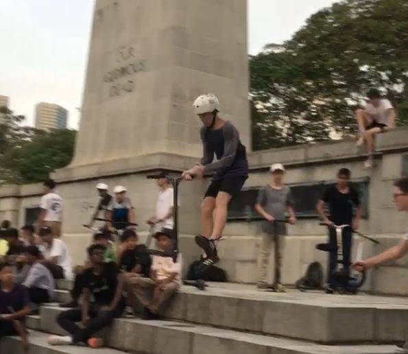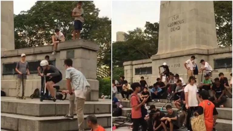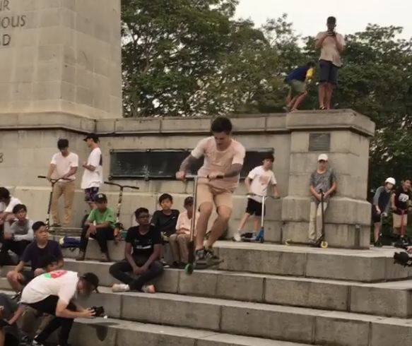 据网民Shaq A. Mohd星期六(17日)傍晚上传到Facebook的视频显示,一群青少年聚集在位于滨海公园(Esplanade Park)的世界大战阵亡战士纪念碑(The Cenotaph)周围玩滑板车。一些男生骑着滑板车从楼梯一跃而下,其他人则在一旁欢呼、拍照。其中两名男生还爬上了纪念碑的矮墙,坐在上头。