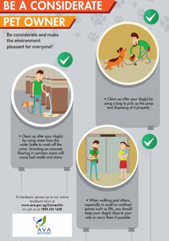 新加坡:农粮兽医局规定,狗的主人必须确保自己所豢养的宠物不会给他人的生活带来不便,如过度吠叫,在公共场所排便,骚扰路人,追逐车辆,咬人等。否则狗的主人会被吊销养宠物许可证,或无法更新许可证。