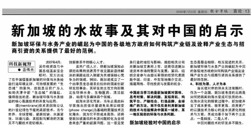 笔者从事膜的研发与应用工作多年,在此以切身的体会,就新加坡的环保与水务经验进行了认真的总结,进而阐述了新加坡经验对中国发展绿色技术、促进循环经济、构筑产业链、打造“生态城”的启示以及推动中新合作的意义。