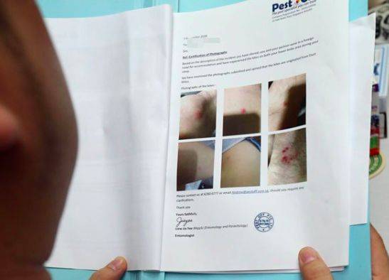 为了证明是酒店客房环境所致,他也找了一家害虫管理公司,通过该公司的昆虫与寄生虫学家分析红点的照片,认为两人的红点是螨虫引起的皮肤过敏所致。他过后发短讯和拨电跟酒店交涉,而且在11月9日请假到新山约谈酒店负责人,对方声称已找害虫管理公司检查房间,但找不到任何昆虫繁殖的踪迹。