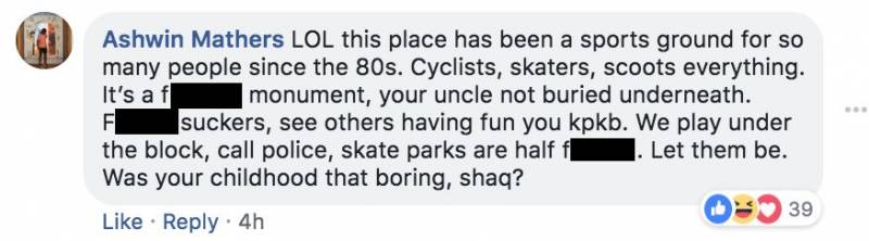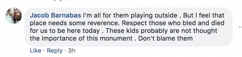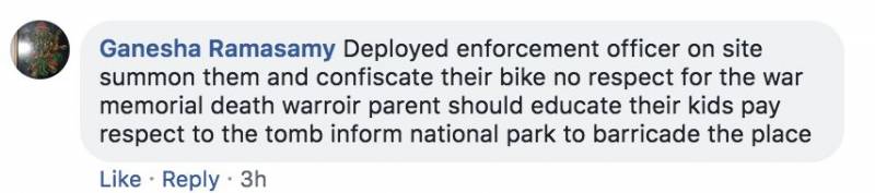 “不尊重战争逝去的英雄战士,应该派执法人员来这里,罚款、没收他们的滑板车;父母也应该教育自己的孩子要尊重墓地,公园管理局也应该在这个地方设立护栏!”