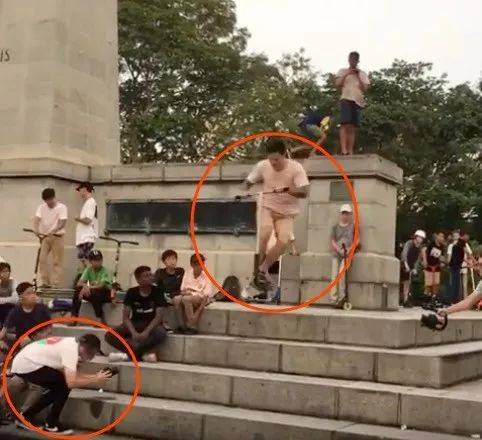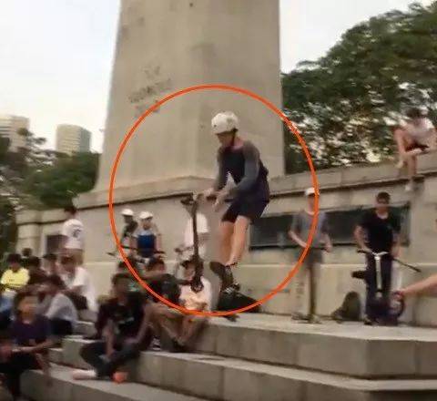 有的人是坐在台阶上聊天、玩手机;有的人则是带着滑板车聚集在台阶的最高层,不一会儿,就有一名深色衣服的少年骑着滑板车从台阶的最上方冲下来,重重的落地,险些摔在地上;