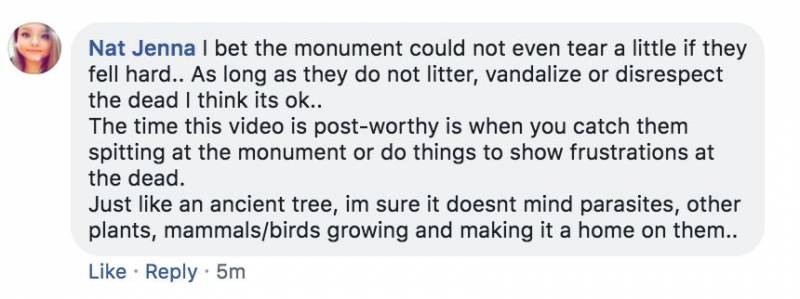 然而也有人持中立态度,认为这群青少年或许并没有被告知这座纪念碑背后的含义,也许只要不对纪念碑造成损害或在地上乱扔垃圾,应该就没问题。